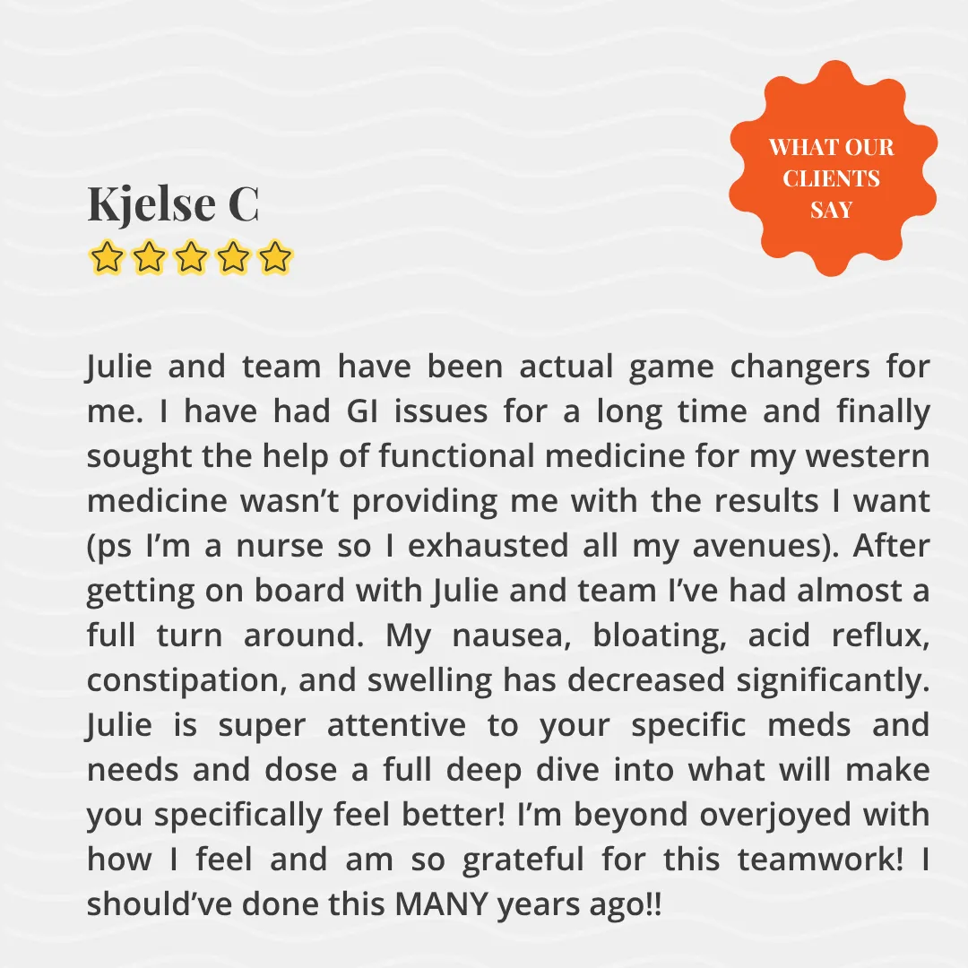 - Carla North“Julie’s approach to discovering the root cause of your health challenges stands out! She and her team truly care about helping you navigate your way to true health.”