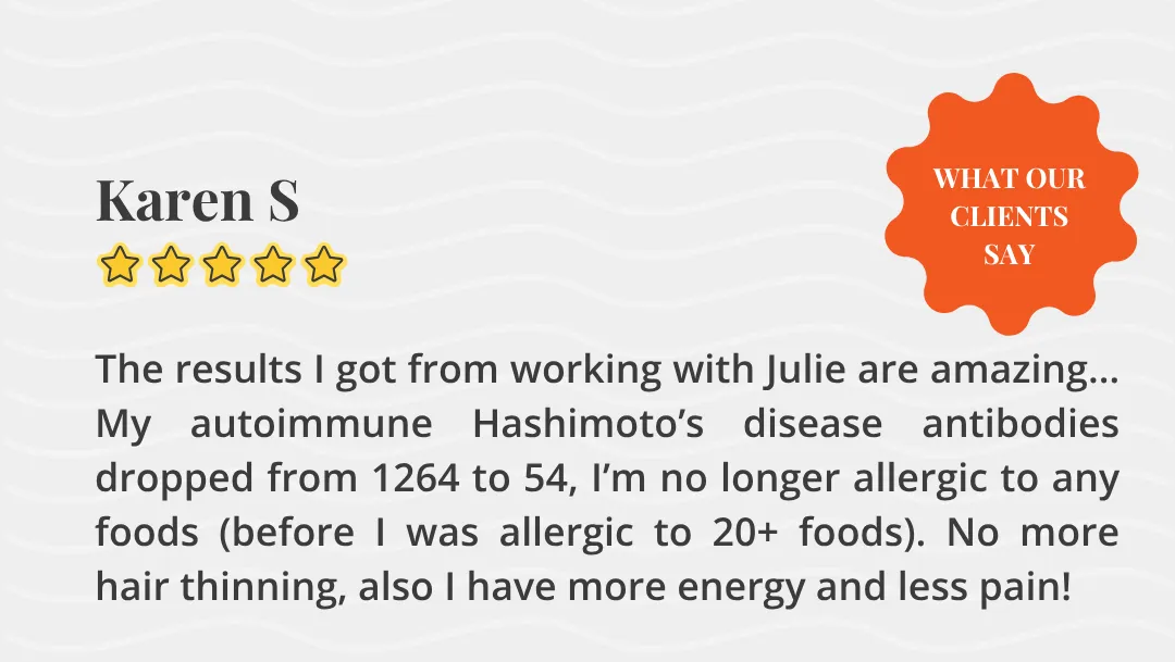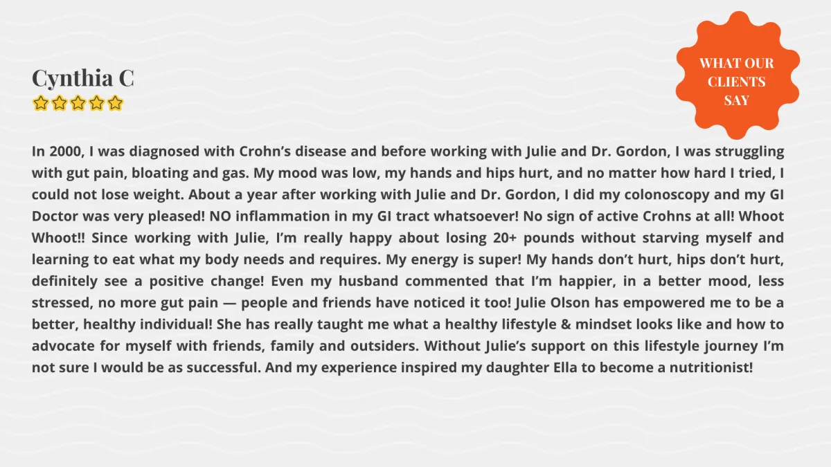 - Carolene Quezada“After being diagnosed with MS, I continued to feel worse... It was Julie who helped me heal my gut and turn my health around.”