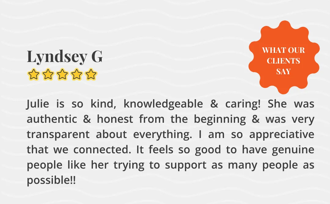 - Adriana Lara“Julie is so kind, knowledgeable & caring! She was authentic & honest from the beginning... It feels so good to have genuine people like her trying to support as many people as possible!!”