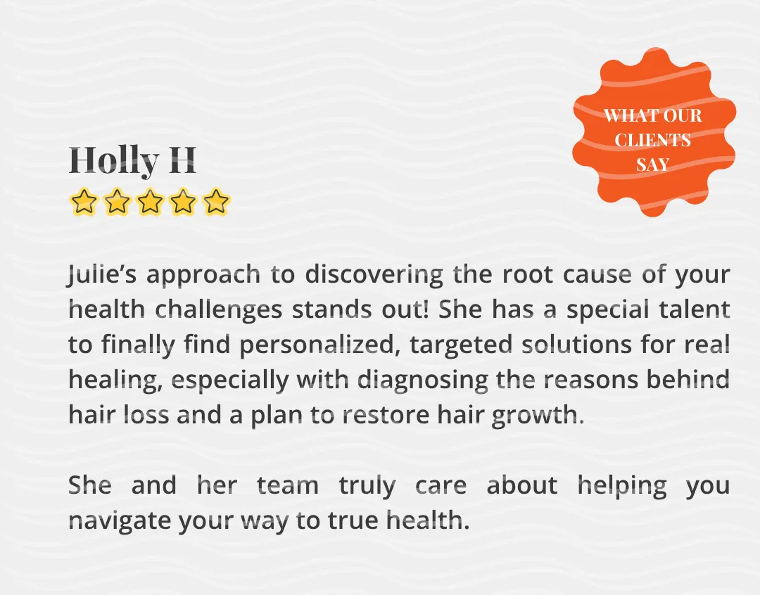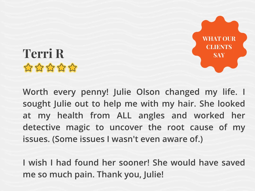 “Other practitioners told me there was nothing I could do about my hair thinning. Through Julie's program with functional labs, she figured out what was out of balance in my body to stop my hair thinning!"