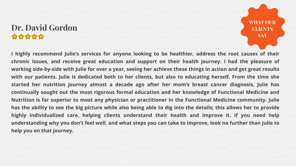 - Michael Nuanes“Julie is very helpful with healthy food choices and appropriate supplements... I could not recommend her enough!”